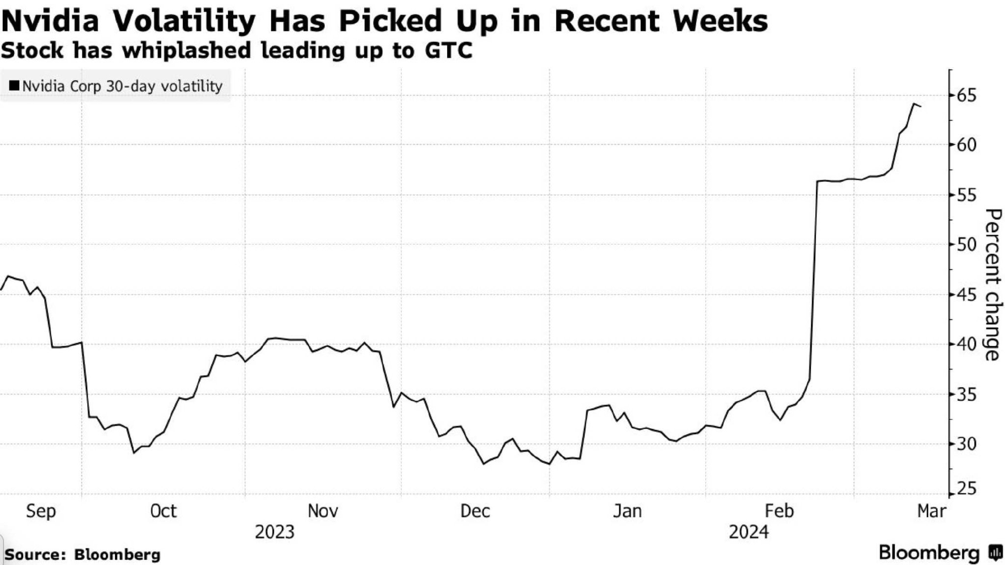 而今年英伟达的出现在GTC大会上具有更重要的意义,因为仅2024年的涨幅就为公司增加了1万亿美元的市场价值,使其成为标普500指数中表现最佳的股票。自3月7日创下纪录高位以来,投资者经历了一段颠簸的旅程:该公司周二股价结束了五个月来最糟糕的两天跌幅,但周三又下滑了。